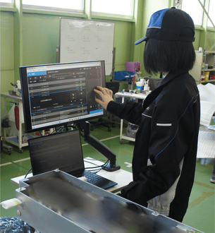また配線と組み立ての作業工程では、ノートパソコンと27インチのタッチパネルディスプレイを設置してSmart Productionの画面を表示して作業支援を行っています。表示される指示にしたがって作業ができるので迷うこともなくスムーズに作業ができ、ミスも減らせて好評です。大型のタッチパネルディスプレイだと見やすく、拡大や縮小など操作もしやすくて便利という声も上がっています。